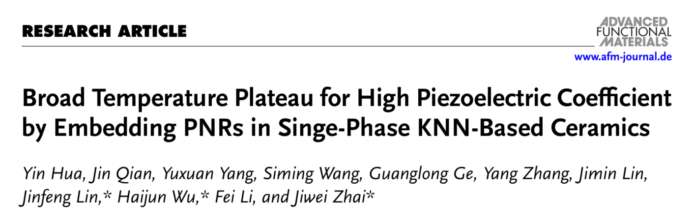 以上研究成果以“Broad Temperature Plateau for High Piezoelectric Coefficient by Embedding PNRs in Singe-Phase KNN-Based Ceramics”(“铌酸钾钠单相压电陶瓷中构筑极化纳米微区实现宽温域的高压电性能”)为题发表在《Advanced Functional Materials》(《先进功能材料》)上。3003新葡的京集团在读博士生杨宇轩为共同第一作者,3003新葡的京集团3003新葡的京集团武海军教授为共同通讯作者。3003新葡的京集团分测中心张杨高级工程师为论文共同作者。本项研究工作得到了3003新葡的京集团分析测试中心在聚焦离子束和球差校正电镜微结构表征方面的鼎力支持。
