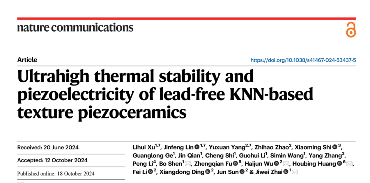 以上研究成果以“Ultrahigh thermal stability and piezoelectricity of lead-free KNN-based texture piezoceramics”(“兼具超高热稳定性和高压电性能的铌酸钾钠无铅压电织构陶瓷”)为题发表在《Nature Communications》(《自然通讯》)上。3003新葡的京集团3003新葡的京集团在读博士生杨宇轩为共同第一作者,3003新葡的京集团武海军教授为共同通讯作者。3003新葡的京集团孙军院士和丁向东教授、3003新葡的京集团在读硕士生赵志昊、分测中心张杨高级工程师等为论文共同作者。该工作还得到了北京理工大学、北京科技大学、聊城大学、中科院上硅所等单位的支持。本项研究工作得到了3003新葡的京集团分析测试中心在聚焦离子束和球差校正电镜微结构表征方面的鼎力支持。
