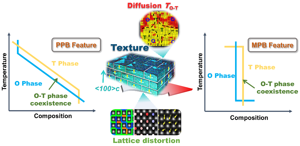 近日,我校3003新葡的京集团材料强度组武海军教授与同济大学研究团队在铌酸钾钠(KNN)基压电陶瓷中创新性地构建了一种具有MPB特征的扩散型PPB相界,用于协同优化压电系数及其温度稳定性。该相界的构建是通过将(Bi0.5K0.5)HfO3引入到0.97(Na0.56K0.44)NbO3-0.03Bi0.5Na0.5ZrO3基质中,并同时结合织构技术来实现的,其中Bi3+和Hf4+有助于扩散型O-T相界的初步形成,而织构技术由于诱导了畴尺寸的增长进一步改善了相界的温度稳定特性。另一方面,织构技术诱导的<00l>C晶体取向和O-T相界的构建可以促进电偶极子的有效翻转,保证了高的压电响应。所开发的(0.97-x)(Na0.56K0.44)NbO3-0.03Bi0.5Na0.5ZrO3-x(Bi0.5K0.5)HfO3(KNN-BNZ-xBKH)织构陶瓷不仅具有高的压电系数(d33 ~ 550 ± 30 pC/N),还呈现出超高的温稳定性(在25-150 °C的温度范围内变化率小于1.2%,在25-250 °C内变化率小于10%)。该工作为解决无铅压电陶瓷中高压电系数和温度稳定性不足之间的难题提供了重要思路。