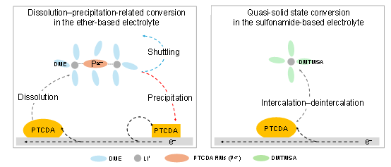有机电极材料由于可以摆脱对过渡金属元素的依赖,越来越受到科研人员的关注。其中PTCDA具有苝和外周富氧原子组成的分子结构,具有较高的电子电导。然而,PTCDA同大多数有机电极材料一样,面临着在有机电解液中的严重溶解及穿梭效应,“毒化”活泼的锂金属负极,最终严重影响电池的循环性能和库仑效率。更重要的是,该溶解−沉淀过程阻碍了对电极氧化还原反应及溶剂共嵌入等基础科学问题的研究。因此,为了解决这些问题,理想的方案是合理设计电解液,从抑制PTCDA的本征溶解角度实现准固态转换,为简化氧化还原反应机理、提高电池性能和基础科学问题的探索奠定基础。