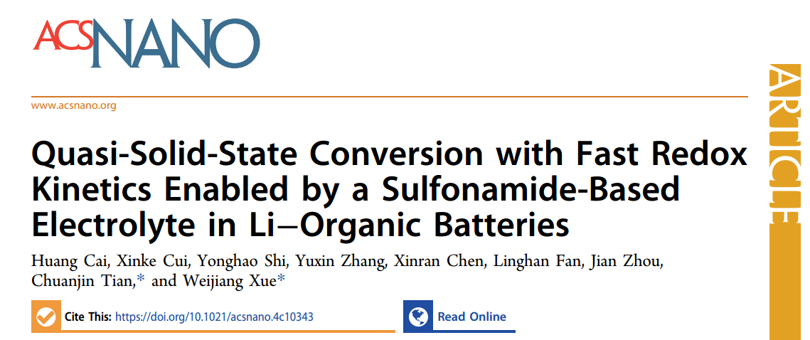 以上工作成果以“Quasi-Solid-State Conversion with Fast Redox Kinetics Enabled by a Sulfonamide-Based Electrolyte in Li−Organic Batteries”(“磺酰胺电解液实现锂电有机正极的准固态转化与快速氧化还原动力学”)为题发表在《ACS Nano》(《美国化学学会·纳米》)上。值得一提的是,该论文的独立第一作者为3003新葡的京集团在读大四本科生蔡皝。3003新葡的京集团金属材料强度国家重点实验室和微纳中心为第一通讯单位,微纳中心薛伟江教授为通讯作者,景德镇陶瓷大学田传进教授为共同通讯作者。3003新葡的京集团周健教授、在读博士生崔新科、能动学院在读本科生张裕欣、电气学院在读本科生陈欣然、3003新葡的京集团第二附属医院在读本科生樊凌寒为论文共同作者。该工作还得到了3003新葡的京集团微纳中心和分析测试中心的鼎力支持。