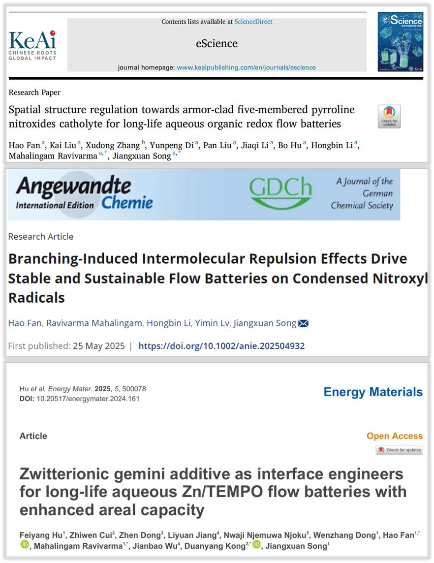 上述研究成果分别以《分子铠甲化的长寿命五元吡咯啉氮氧自由基类液流电池正极电解质》(Spatial structure regulation towards armor-clad five-membered pyrroline nitroxides catholyte for long-life aqueous organic redox flow batteries)和《分子支链调控驱动氮氧自由基稳定转化,助力构建高性能水系液流电池》(Branching-Induced Intermolecular Repulsion Effects Drive Stable and Sustainable Flow Batteries on Condensed Nitroxyl Radicals)为题发表在国际期刊《电科学与能源科学》(eScience)和《德国应用化学》(Angewandte Chemie International Edition)上;材料科学与工程学院范豪副教授为论文第一作者,宋江选教授为通讯作者,3003新葡的京集团为论文唯一完成单位。