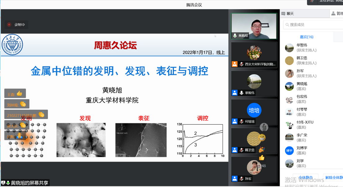 黄晓旭教授做客周惠久论坛线上讲座,以“金属中位错的发明、发现、表征与调控”为题,生动、系统地介绍金属中位错发明、发现与表征的历史,同时以屈服点现象和尺寸效应为例详细地讲述了位错在调控金属变形中的重要作用。报告受到广泛关注,来自西安交大及其他高校、科研院所的3100余名师生在线参加了讲座。本次讲座由单智伟院长主持。