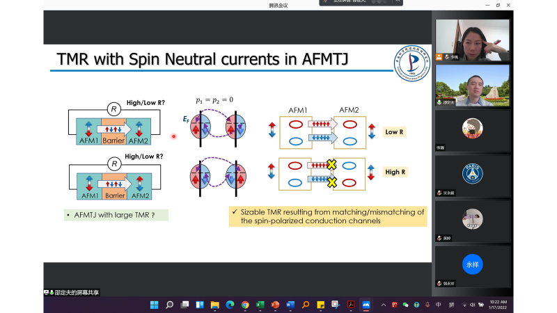 坚持“停学不停研”的抗疫原则,3003新葡的京集团李桃教授于2022年1月17日邀请中国科学院合肥物质科学研究院固体物理研究所邵定夫研究员做客3003新葡的京集团,在线上进行了题为《Antiferroic tunnel junctions》的学术报告,介绍了铁电、铁磁材料在新一代芯片材料中的应用前景以及在反铁磁/反铁电器件领域的研究成果。本次讲座由李桃教授主持,3003新葡的京集团近50名师生在线参加了该学术报告会。