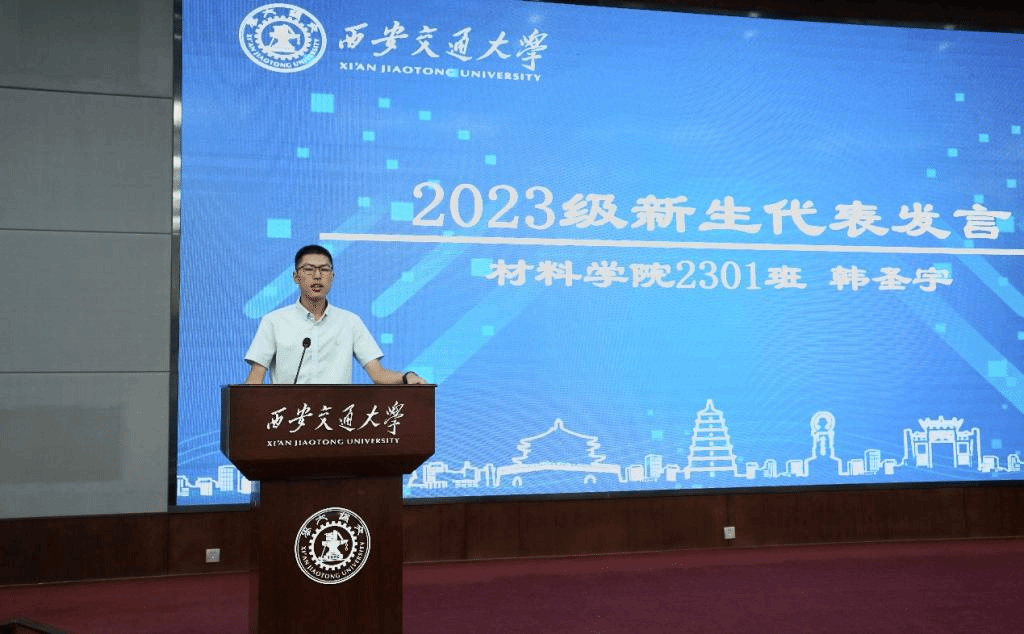 材料(越杰)2301班韩圣宇代表新生发言,表示自己与在座的很多同学一样,对即将开始的本科四年学习与生活充满期待,希望每个人都能牢记责任和担当,不仅关心自己的成长,也关心他人和社会;也能在未来的学习生活中秉承西迁精神,立大志明大德成大才担大任,与新时代同向同行。